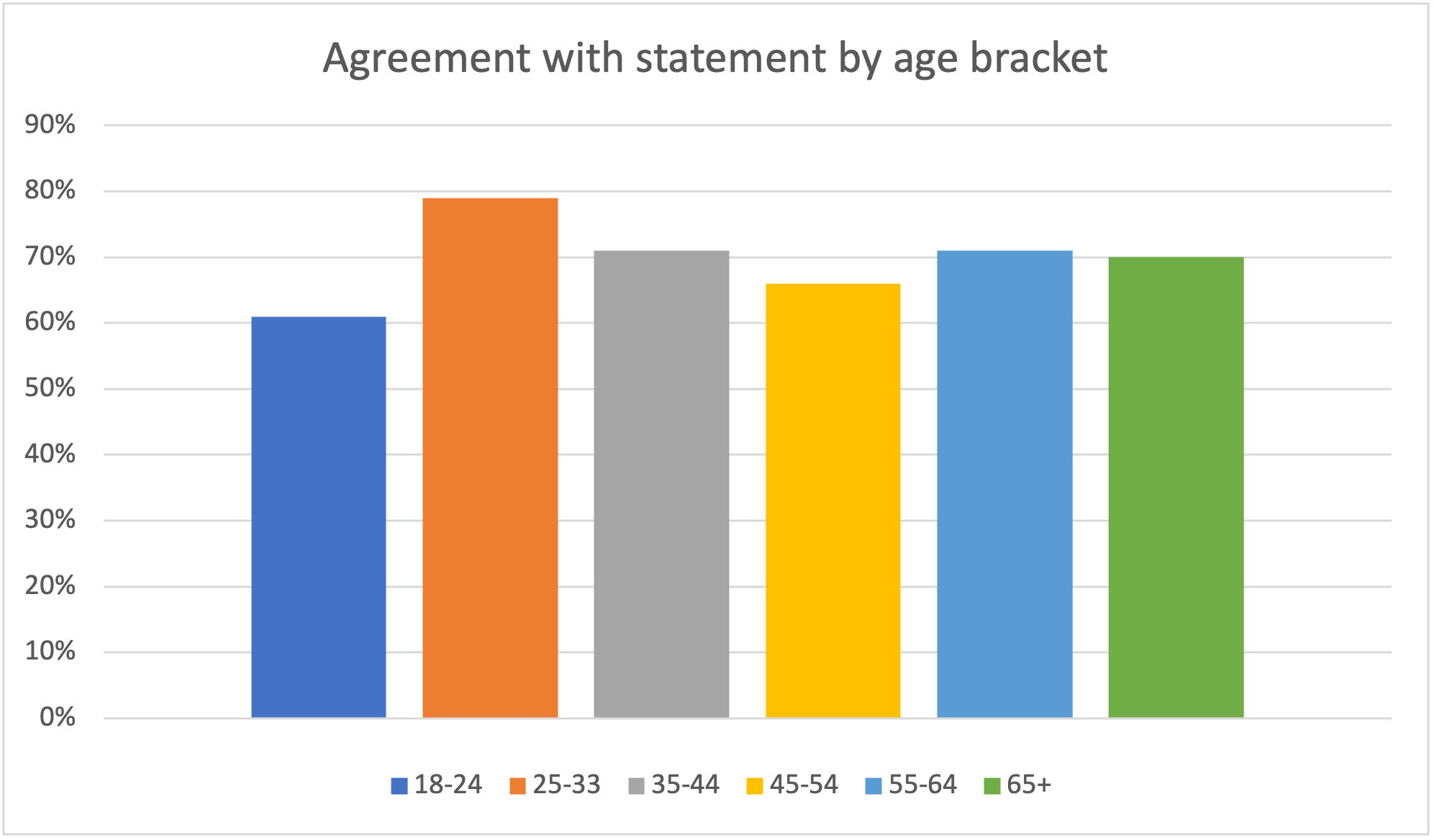 The highest level of agreement was in the 25-34-year old age bracket at 79%.