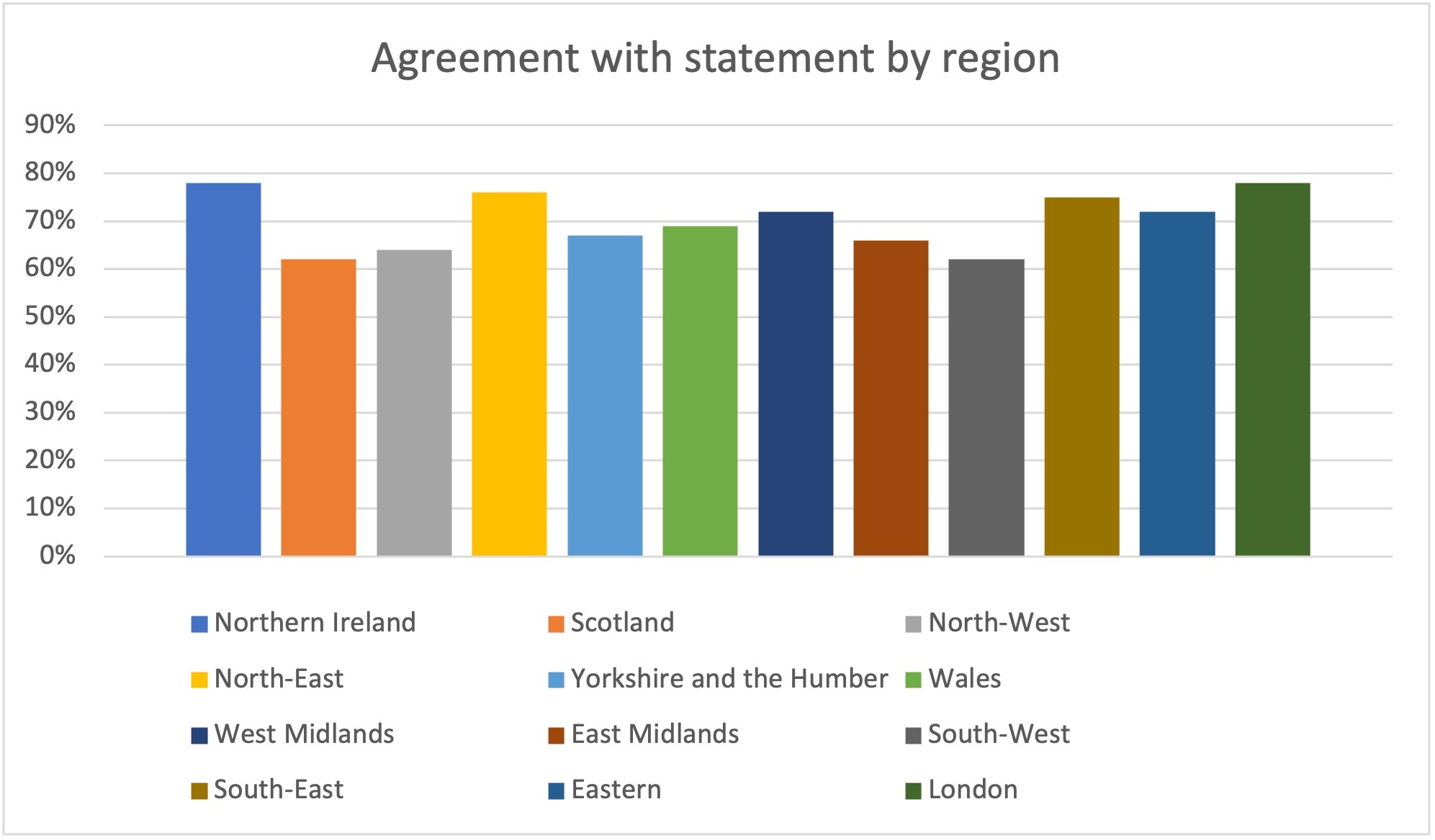 The highest level of agreement was from respondents in Northern Ireland and in London, both at 78%.